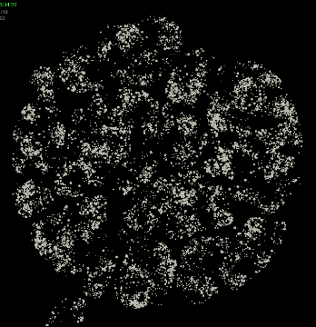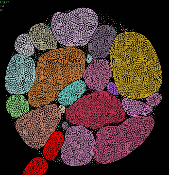 The initial arrangement of bubbles was generated out of randomized little loops of “string” that were forced to grow on a 2D plane until they self-collided, and then smaller bubbles were seeded into the gaps between the originals. I converted the hollow loops into thin discs, and then dragged a constraint object that was tied to one of the small moving bubbles through the scene. A custom force field applied pressure to the bubbles to keep them pushing towards the center.